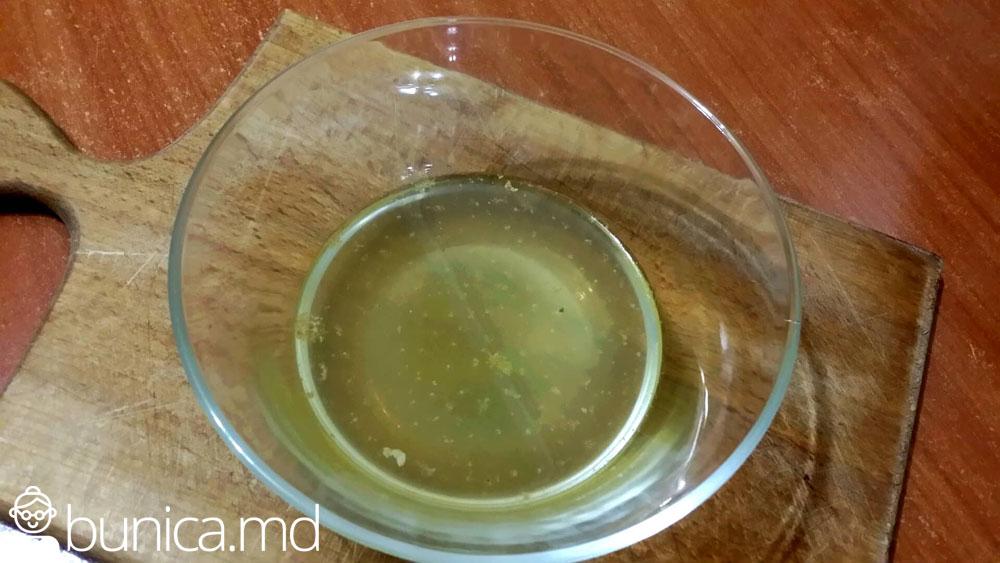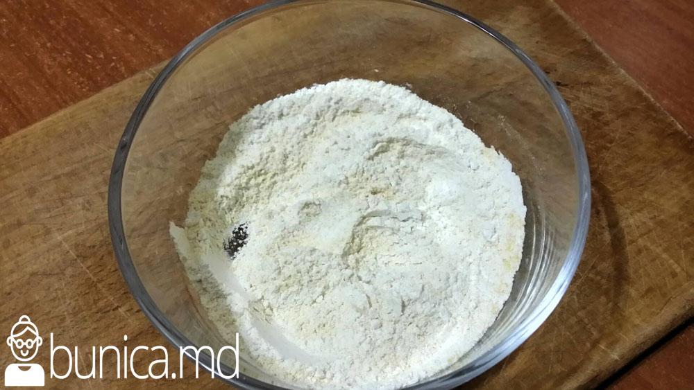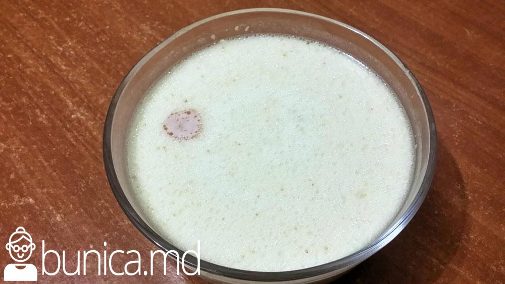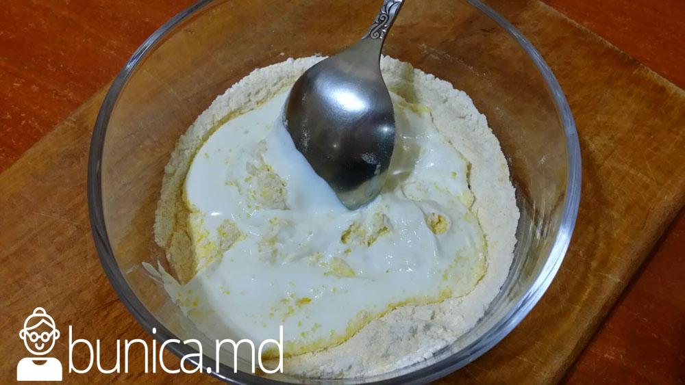 Luăm 300 ml zeamă. Lăsăm să se răcească. Adăugăm cîte puțin făina de grîu și făina de porumb, amestecăm cu un tel, adăugăm smântîna și iarăși amestecăm.
