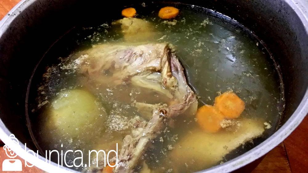 Mai întîi pregătim carnea de rață. O punem în apă rece pe cîteva ore. Punem apa la fiert. Cînd apa începe să fiarbă, cufundăm carnea. În așa fel, zeama nu va face multă spumă. Ridicăm spuma. Fierbem carnea la foc mic pentru ca zeama să fie limpede. Punem în zeamă morcovii tăiați rondele și cepele întregi pentru a-și păstra mirosul ( celelalte legume). Cînd carnea va fi gata, stingem focul, scoatem ceapa și carnea din zeamă.