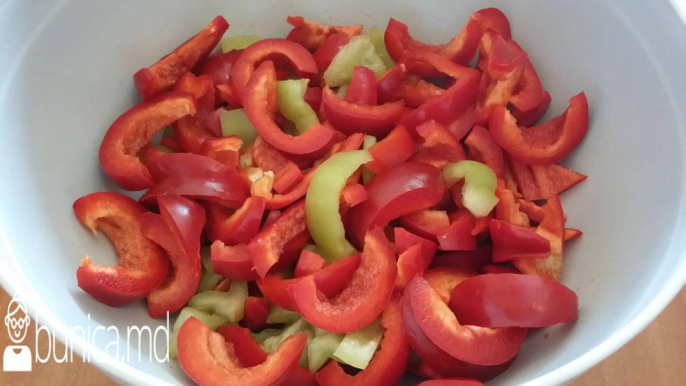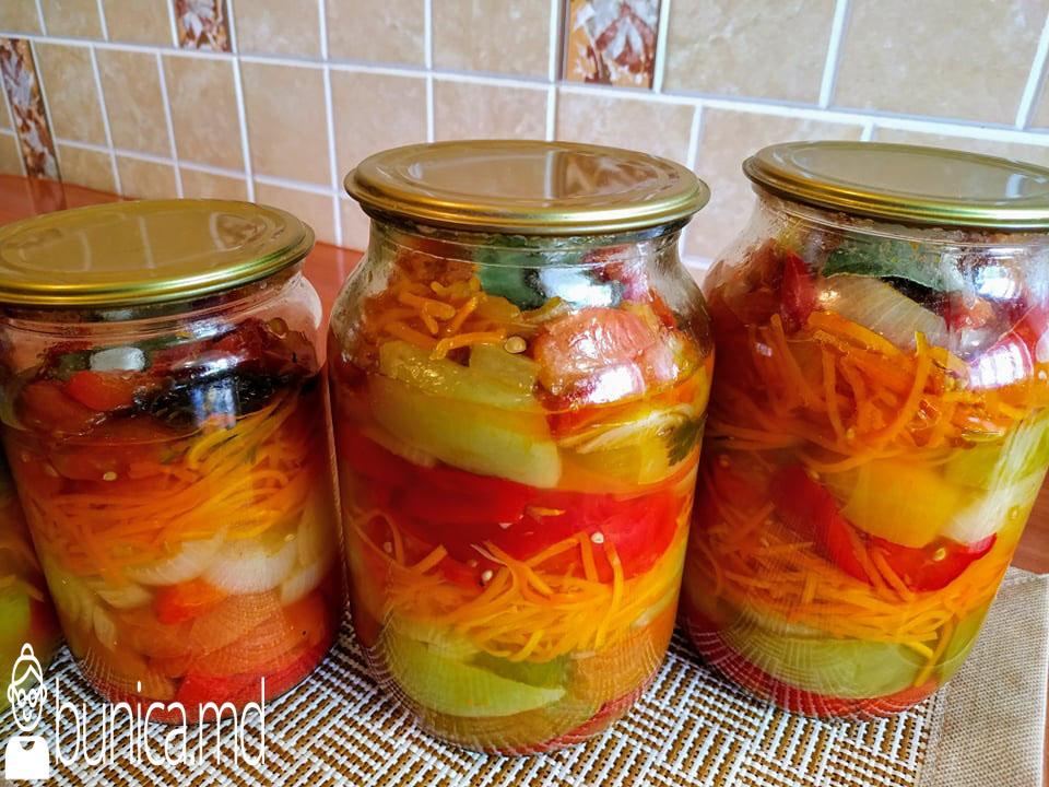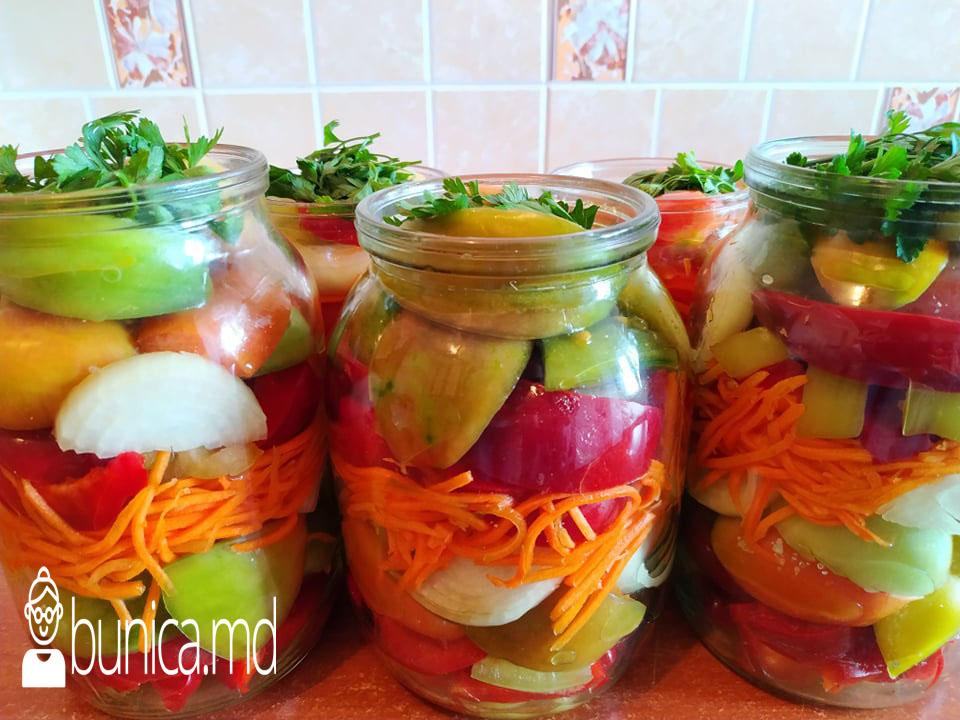 Toate legumele pregătite din timp le punem într-un vas adînc. Putem să le amestecăm și mai apoi să le punem în borcan la sterilizat sau să le aranjăm în straturi, pentru un aspect mai frumos, așa cum am procedat eu.