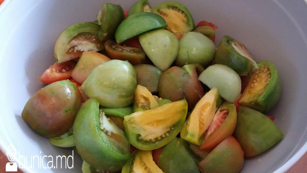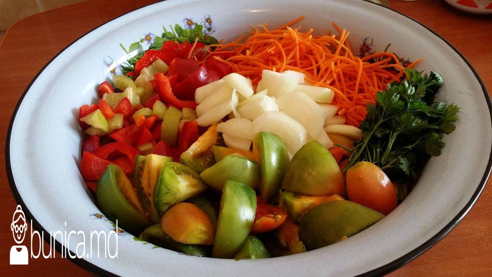 Ingrediente: 4 kg.roșii verzi sau pușin buratice, 1 kg.morcov, 500 gr.ardei gras, 500 gr.gogoșari, cîteva cepe medii, ulei, sare, pătrunjel, cîteva frunze de dafin, aspirină.