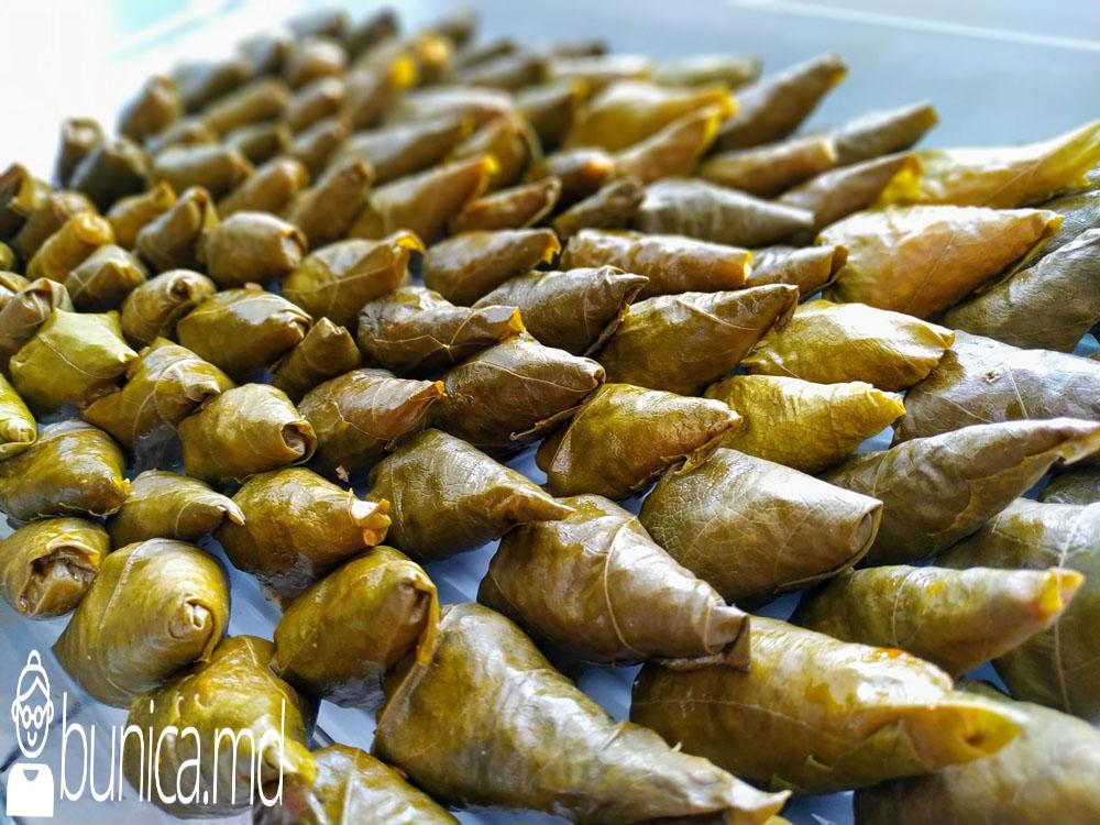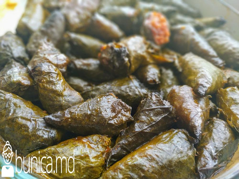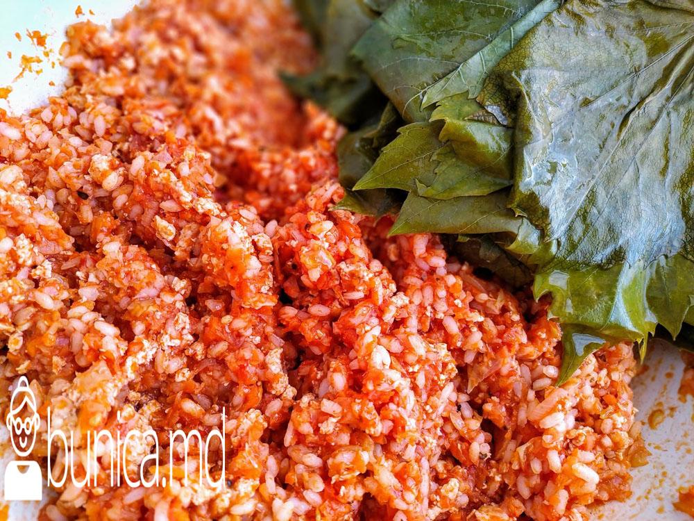 Carnea o tocăm şi o călim în ulei la foc mic. Ceapa, morcovul, varza trecută prin răzătoare pîna se înmoaie puţin. Adaugăm pasta de tomate și mai călim toate legumele încă 5 min, sărăm după gust. Orezul îl spălăm în cîteva ape pînă ne asigurăm că este curat și îl încorporăm în legumele şi carnea răcite. Adăugăm condimentele ,verificăm dacă mai necesită sare . Frunzele de vie le spălăm cu apă. Într-un castron punem apa la fiert. Cînd apa începe a fierbe, cufundăm frunzele în apă pentru 20- 30 secunde. Le scoatem repede și le lăsăm să se răcească.
