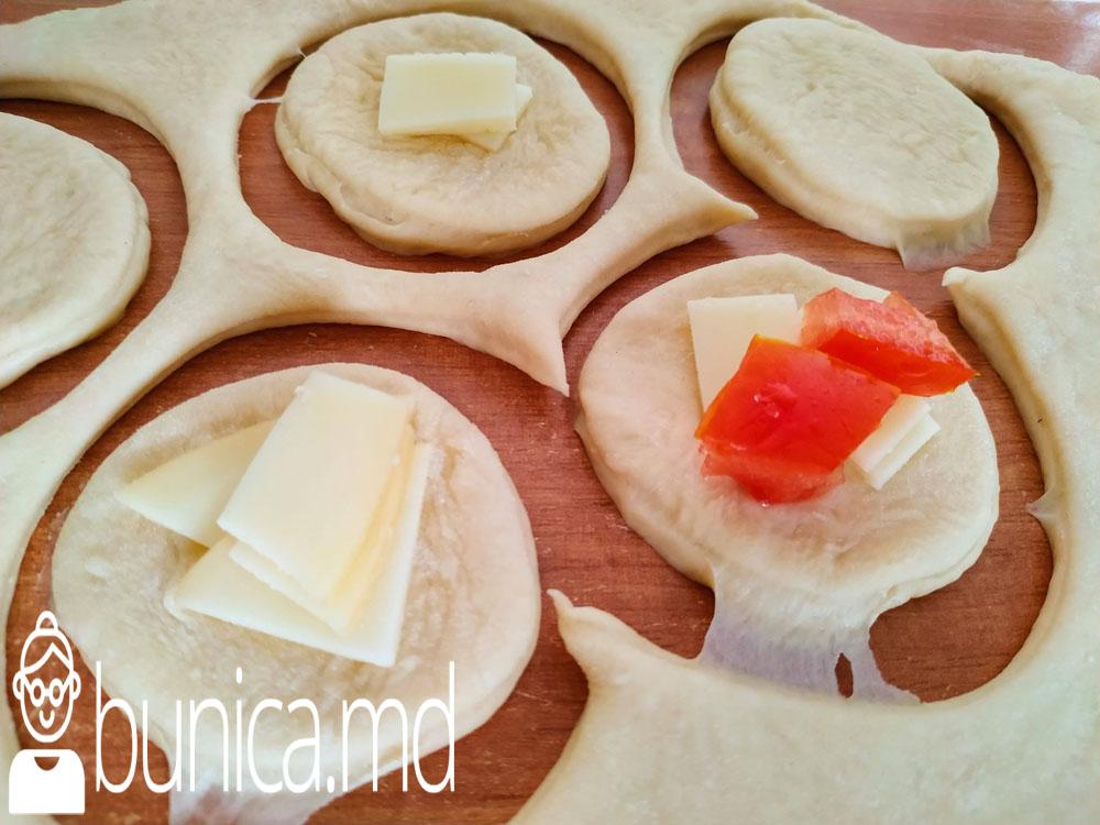 Împărțim coca în două părți. Întindem fiecare cocă cu citorul pe masa presurată cu făină. Cu un pahar facem forma. Punem umplutura pe fiecare cerculeț și ăl adunam ca pe o punguță.
