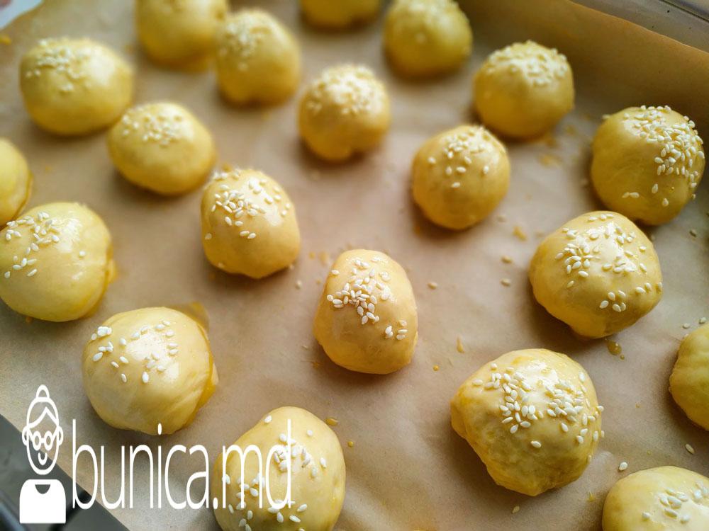 Fiecare gogoașă modelată o punem în tava tapetată cu hîrtie. Le ungem deasupra cu gălbenuș de ou.