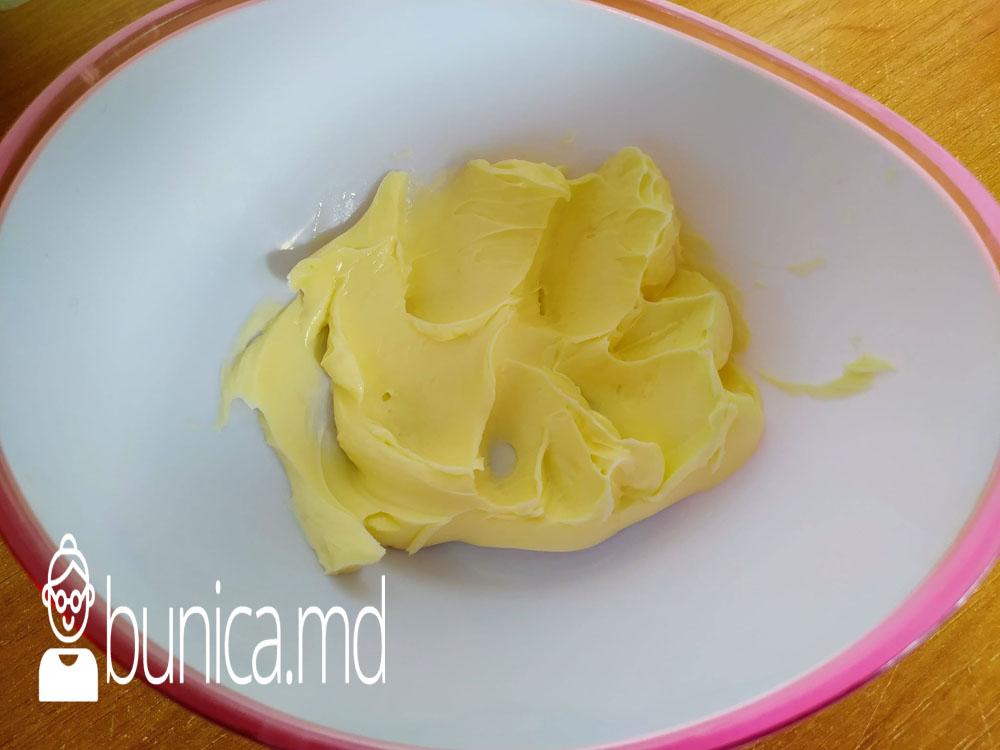 Adăugăm treptat făina, mai întîi 3-4 pahare, apoi la necesitate mai adăugăm făină. Nu frămîntăm aluatul pînă la urmă, ci adăugăm untul de temperatura camerei.