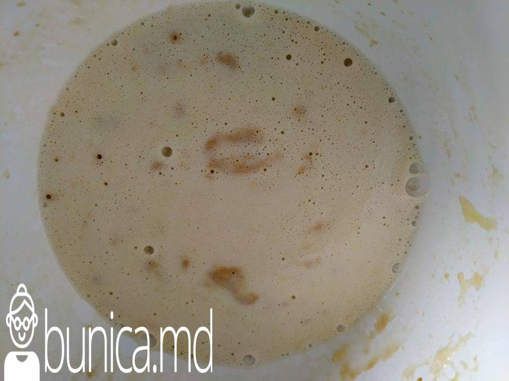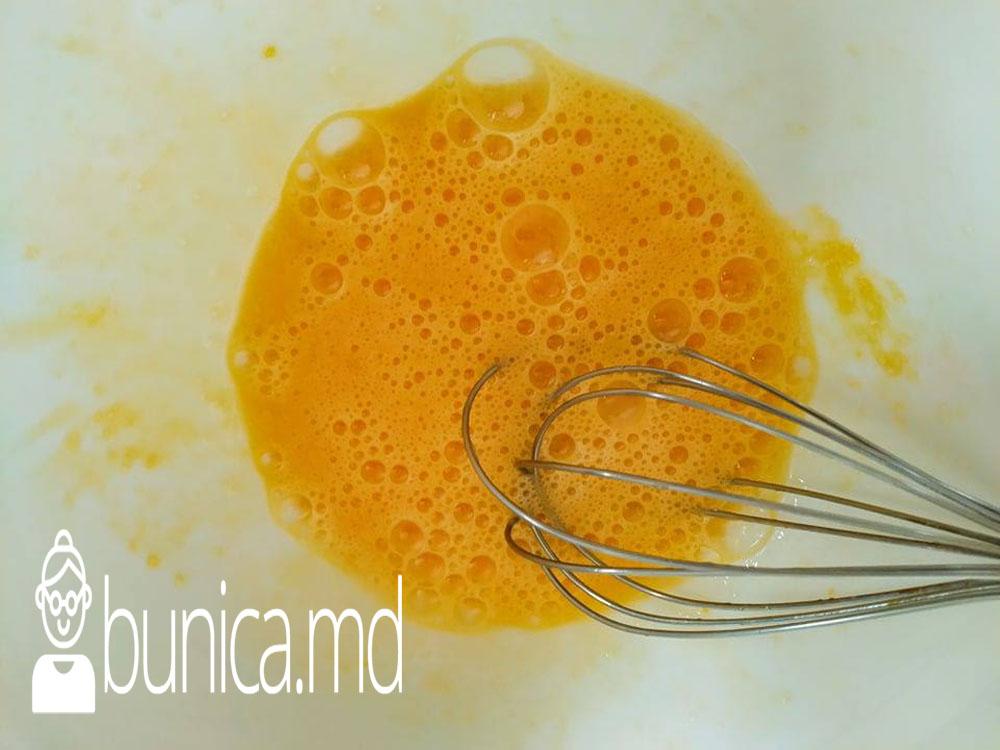 Între timp batem ouăle cu 1 lingură de zahăr. Se bat 1- 2 minute. Se adaugă în compoziția de lapte și drojdie.