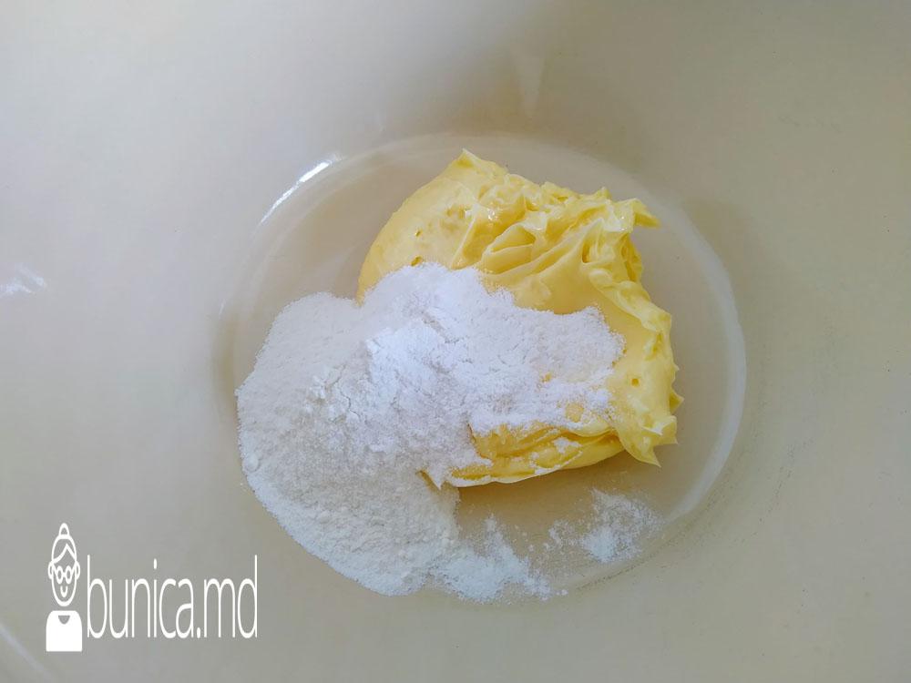 În alt vas amestecăm cu un tel untul de temperatura camerei cu zahărul pudră.