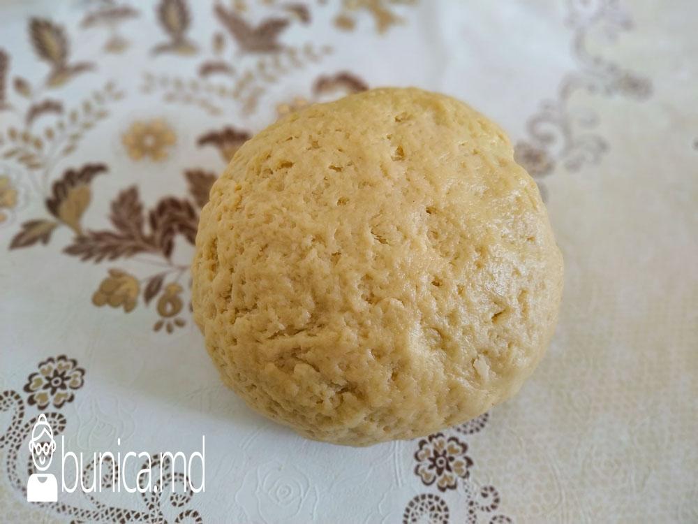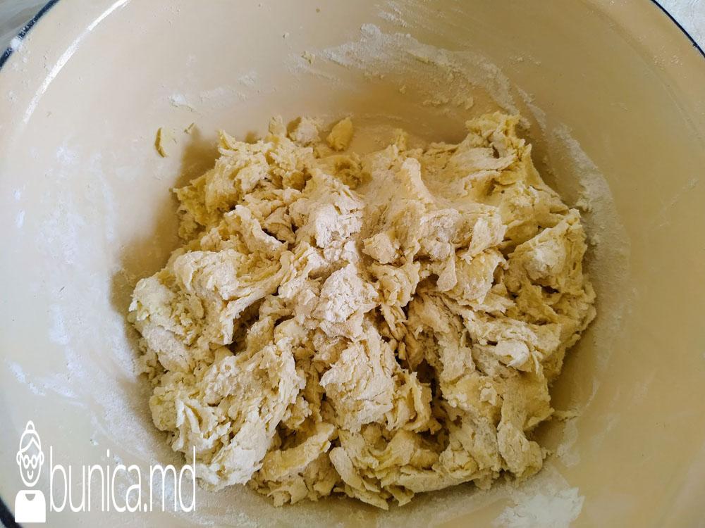 Punem aici smîntîna și praful de sare. Amestecăm, după care adăugăm treptat făina. S-ar putea să avem nevoie doar de 500 gr făină, dar s-ar putea să avem nevoie de toată făina. Modelăm coca de aluat. O punem la rece pe 1 oră.