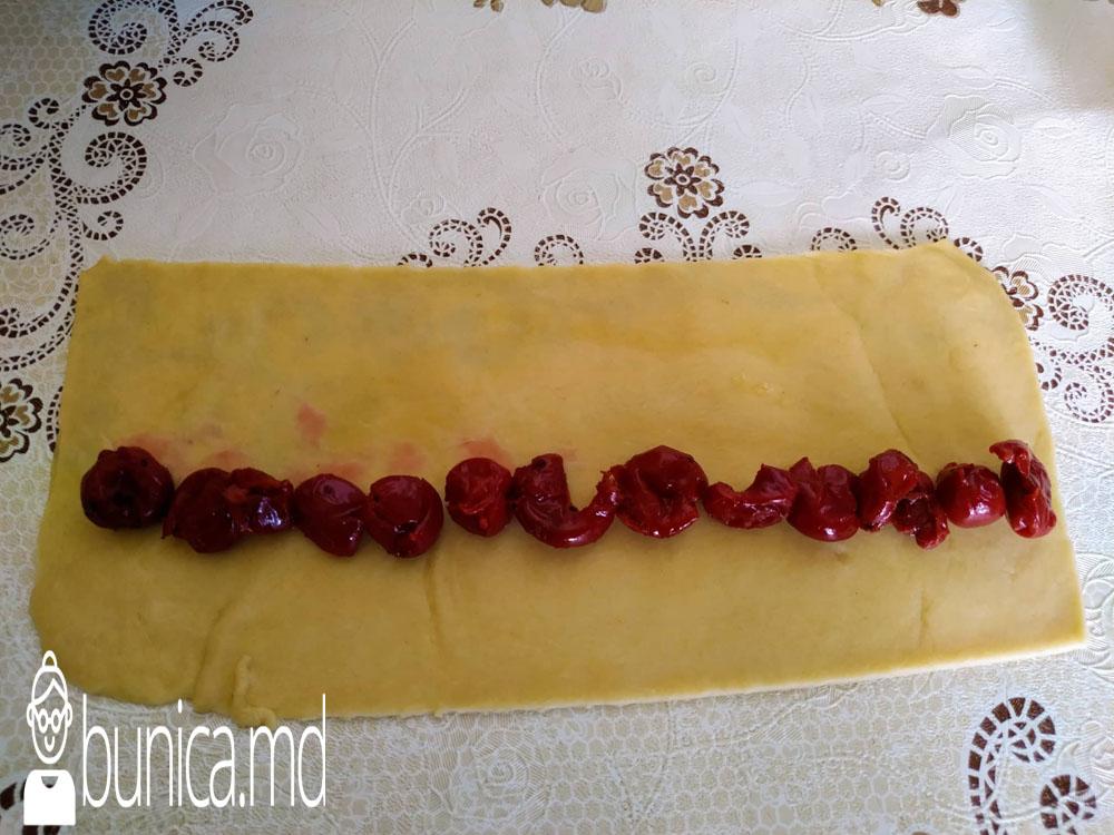 Ingrediente rulouri: 150 gr unt(untură), 250 gr smîntînă 25%(sau de casă), 50 gr zahăr pudră, jumătate linguriță bicarbonat de sodiu, un praf de sare, 500-550 gr făină, 350 gr vișine fără sîmbure.